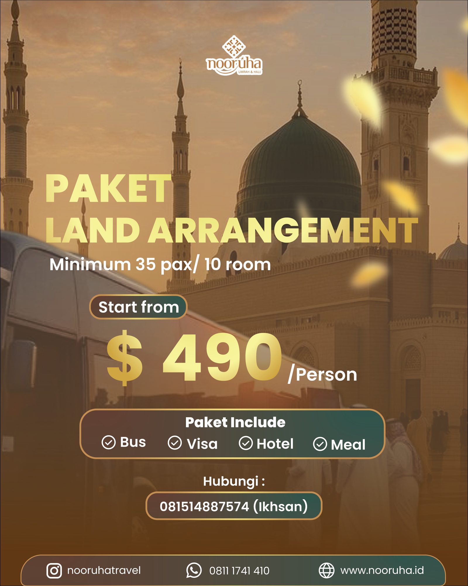 Paket ini sangat cocok bagi jamaah yang sudah memiliki tiket penerbangan sendiri, namun tetap ingin kenyamanan dan layanan lengkap selama berada di Tanah Suci. Dengan memilih Land Arrangement, jamaah bisa lebih fokus beribadah, menikmati waktu di Mekkah dan Madinah dengan tenang, serta merasakan pengalaman perjalanan spiritual yang tertata rapi tanpa harus memikirkan urusan teknis perjalanan.